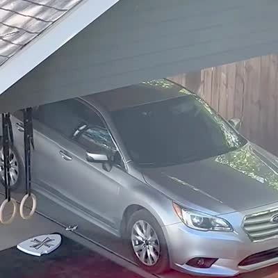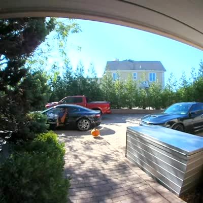 A man pulls into the driveway then he yells at something off camera. Suddenly three deer run out from the bushes in the front yard. Security footage.