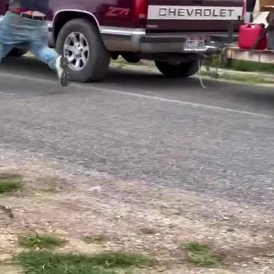 A man tries to slam a pickup truck's tailgate shut on a driveway, but it reopens and hits him in the groin. Security footage. Person across the street not talent released.