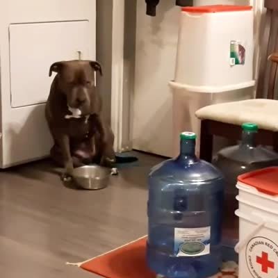 "Hurry Upper with My Supper" A dog bangs her bowl around in the corner so people will hear her in the laundry room.