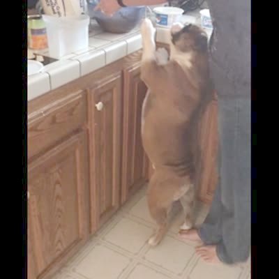 A dog stands up on its back legs in the kitchen and knocks over a bowl of batter on the counter while its owner blends it. No audio.
