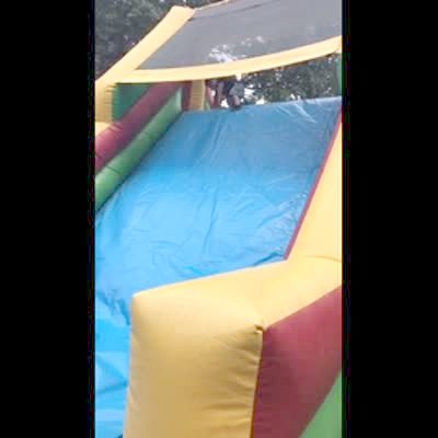 A tot boy goes down a bouncy slide then his feet plant and he flips forward and face plants on the bottom.