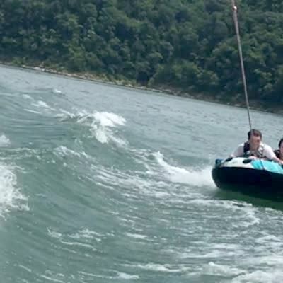 A teen girl rides in a tube that gets pulled by a boat through a lake and she flies off and falls in the water after she hits a wake.