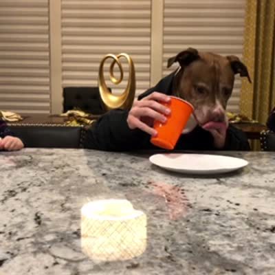 A pit bull dog eats at a counter with human hands and grabs a tot girl's sandwich and eats it.