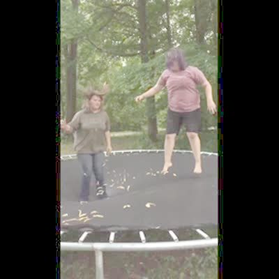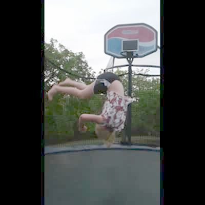 Two teen girls do front flips at the same time on a trampoline in the yard and the trampoline rips and they fall through to the ground.