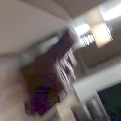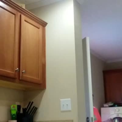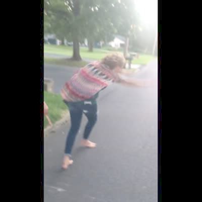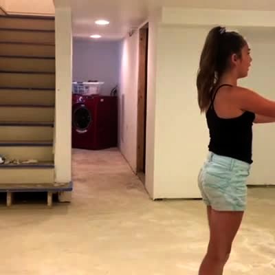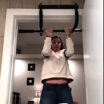 A teen girl tries to hang from an exercise bar in a doorway. The bar breaks off the door, and she falls to the ground. Then a fishing pole rod falls on top of her.