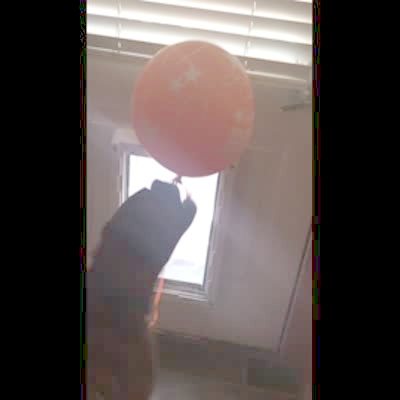 A boxer dog repeatedly tries to pull a balloon through a doggie door and eventually pushes it through.