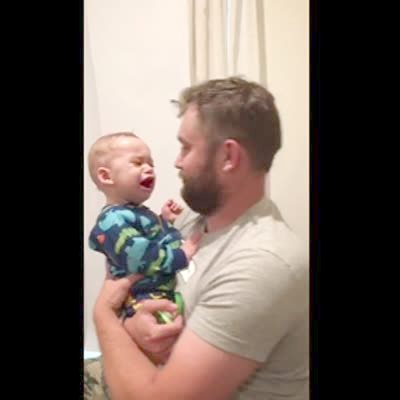 A man plays hide and go seek with his tot son, who only hides his head under a mattress pad. His dad asks if he is hiding in various spots and the tot boy answers no.