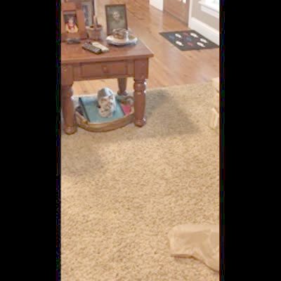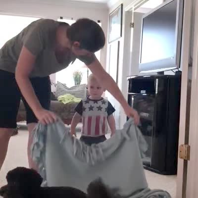 A woman and her tot son try to do the What the Fluff Challenge with their dog. The woman drops the blanket, her tot son turns and runs into an entertainment center.