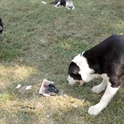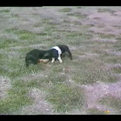 "Double Bone Burglar" A woman lays two bones in front of two dogs but makes them wait to take the bones. When the woman lets them, the black dog grabs both bones and runs.