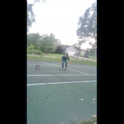 A teen boy jumps over two skateboards on his skateboard and then falls backwards over a tennis net.