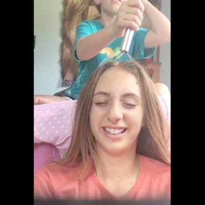 A young girl scratches another young girl's head with a head scratch tool. A metal piece from the tool pokes the girl's eye.
