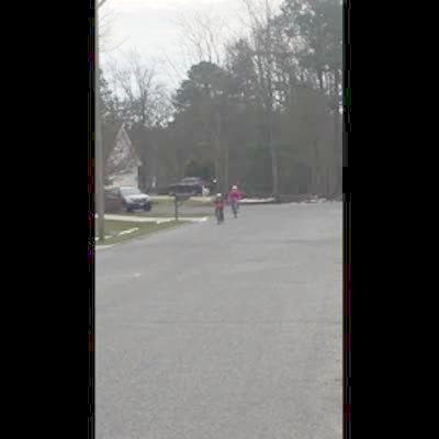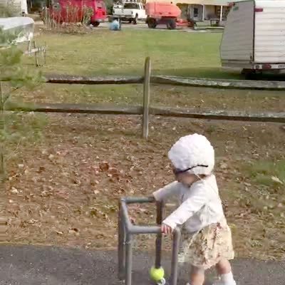 A tot girl pushes a homemade walker down the street while she's dressed as a senior woman.
