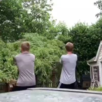 Two teen boys pull ropes to collapse a deck in the yard and part of it breaks, but the rest of it stays up. At 4:20, one of them uses an ax to break the support beam and the whole thing falls on him.