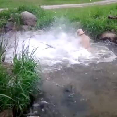 A Labrador Retriever dog jumps off of a boat outdoors and into a fish frenzy in a lake.
