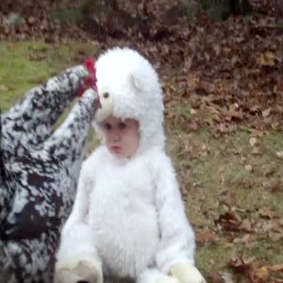 A baby boy with a sheep suit on sits on the ground being pecked by chickens.