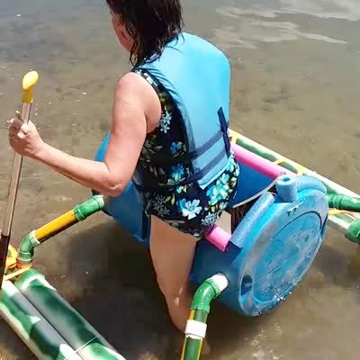 A woman sits in a homemade small plastic boat in a lake and the boat breaks apart and she says that she forgot to glue parts of it together.