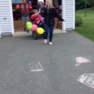 A family celebrates their father's birthday with a fake parade. He sits in a cart and a woman pulls it, and a man and woman walk beside the cart and laugh. The man leans back, and the cart flips backward.