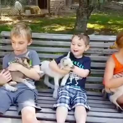 A young boy, tot boy, and young girl sit on a bench and hold baby goats. The tot boy holds a baby goat that screams. The tot screams back, and they repeat this.