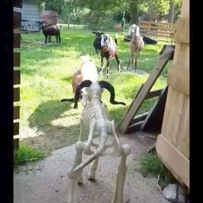 A man puts a fake skeleton goat Halloween statue in a barn near a group of goats. One goat walks to the statue and smells it as the others watch. The man moves the statue and scares the goats.