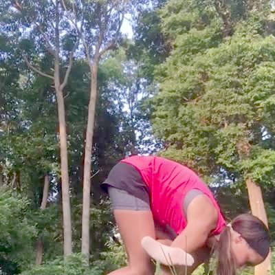A woman in a backyard tries to do a yoga pose, and puts her phone in the grass to film. A chicken walks through the video, looks at her phone, and walks away.