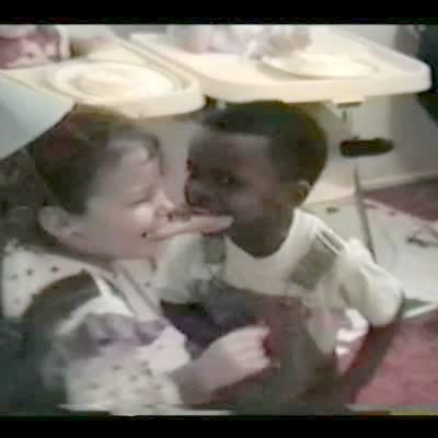 Boy and girl hold same slice of pizza in their mouths and spin around, giggling - at birthday party.