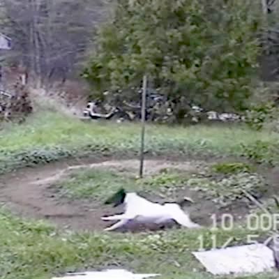 A Labrador dog barks and growls at a mounted deer head before he runs out of the living room while a woman holds it.