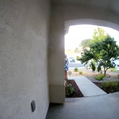A man delivers a package and gets scared by a motion sensor Halloween decoration on a front porch. Security footage.
