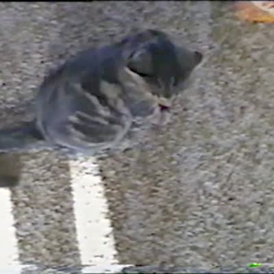 A cat sits on the living room floor and pushes a kitten away when it comes close. The kitten sits down and then suddenly jumps and tackles the larger cat.