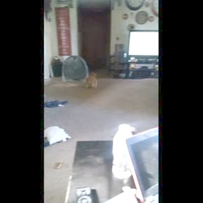 A hyper dog runs into the frame and out in a house and then he runs in and suddenly has a bra on his back.
