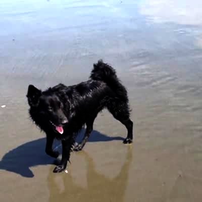 A dog in a lake suddenly runs towards his family, trips and falls, doing a front flip.