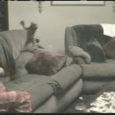 "Downward Dog Pants" Two dogs greet a woman as she comes home and she pets them. They pull her pants down in a living room when they tug on her pants drawstring. Security camera footage.