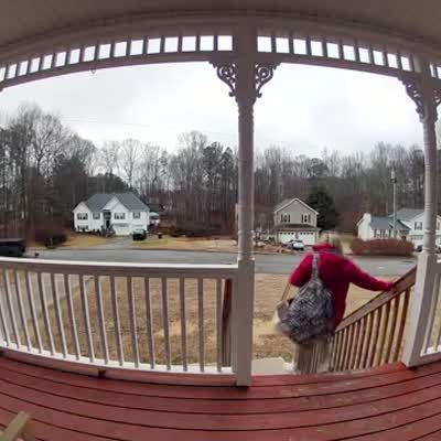 A woman walks out of the house and slips and falls on the icy sidewalk. Security footage.
