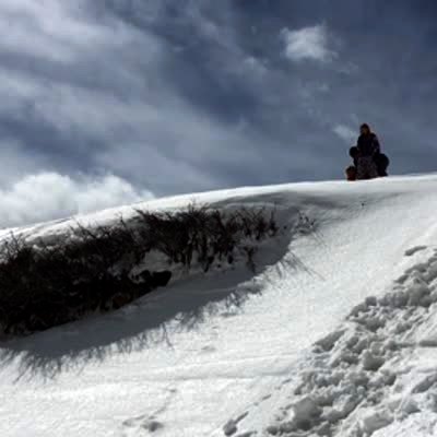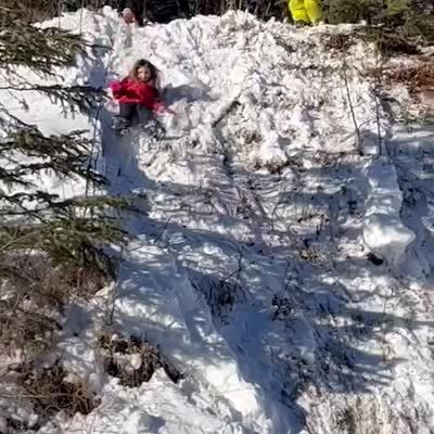 A man sleds down a cliff with a dog, then a young girl slides down the cliff and hits a rock, and a man follows after her, hits the rock, pulls a tree out of the ground, and face-plants on the ground.