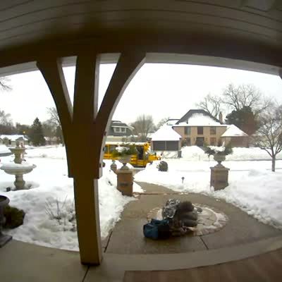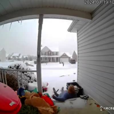 A teen boy walks of the front porch and slips on a patch of ice while he walks toward a school bus parked on the street and an adult male asks "are you alright," and walk toward the teen boy and then slips on the same patch of unseen ice to his back. Security footage.