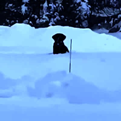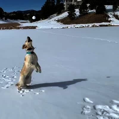 A dog jumps in slow motion to catch a snowball that a person threw from off camera. The dog does not catch it and comes back down and falls in the winter snow.