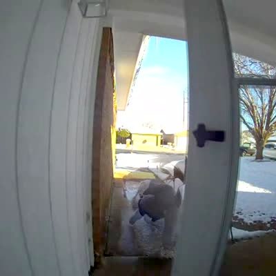 A young girl slams a door as she leaves the house, and a large amount of snow falls off the door and onto her head and shoulders. Security footage.
