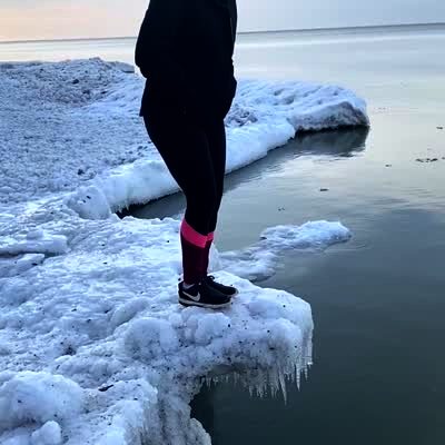 A woman steps up onto a frozen ledge made of ice and snow over a lake and it breaks and she falls in the water.