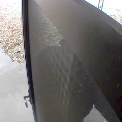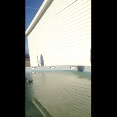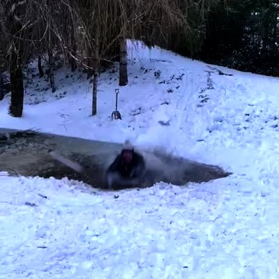 A teen boy checks how thick the ice is on his above ground swimming pool. When he steps onto it, it breaks and he falls into the ice-cold water. Security footage.