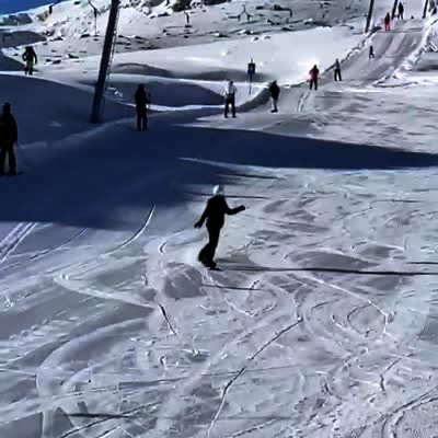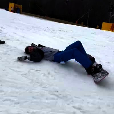 A young girl snowboards down a hill, and a man yells for her to brake, but she falls on her face. Featured talent cleared only (girl snowboarding).