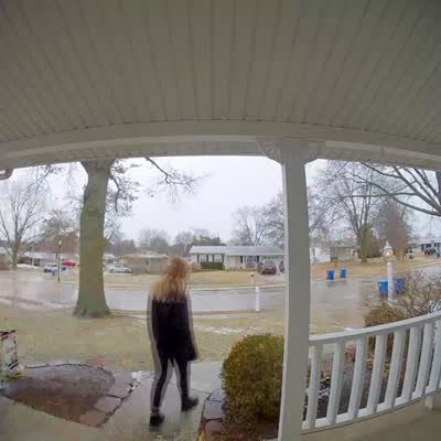 A teen girl slips and falls on icy porch stairs, and she slides on her butt all the way down into a yard. Security footage.