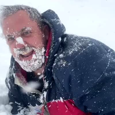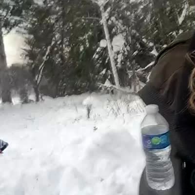 A woman in a car records the snow outside her window with the window open. They pass by a snow blower and the woman gets covered in snow as she screams. The man who drives tells her she should've been more careful.