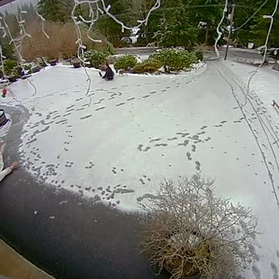 A man shovels snow on the driveway, until a tree branch breaks and dumps snow on the driveway again. Security footage.