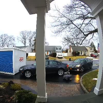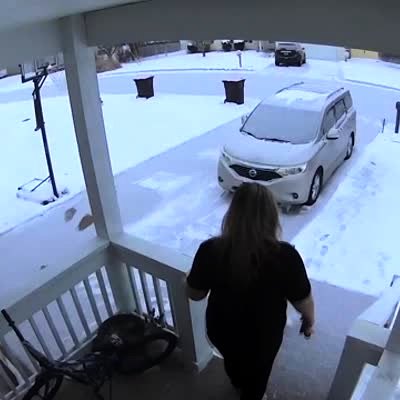 A woman who walks out of the house into the driveway and slips on ice and falls. Security footage.