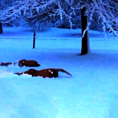 Two teen boys in Speedo swimsuits dive into the winter snow and swim through it across the yard.