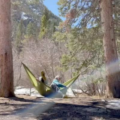 A man and a woman sit on a hammock between two tall trees in the woods. The woman reaches forward, and the hammock falls on the ground.