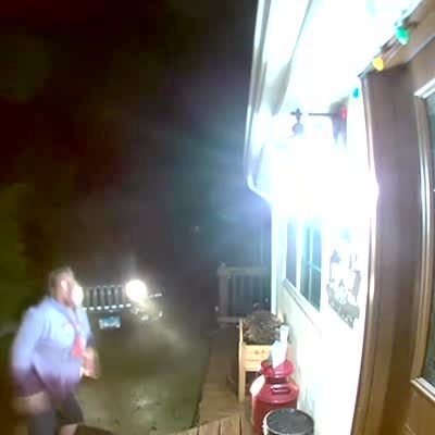 A man walks up the icy driveway with his hands full of Christmas gifts and he slips and flings gifts everywhere and groans. Security footage.