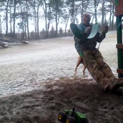 A father starts a tractor with his young son's sled attached to it, but the boy falls on his butt in the snow as soon as it moves.