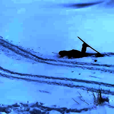 A young boy dances and skates on top of his frozen pool in the winter snow then the ice breaks and he falls in then pulls himself out.