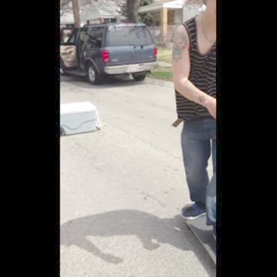 A man jacks a car up in the driveway and a Great Dane dog repeatedly jumps in sync with him.