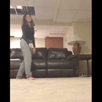 Teen girl imitates Risky Business dance in the kitchen. She stands on a table, jumps off holding a cane. She trips & falls down in the doorway. Long for edit.
